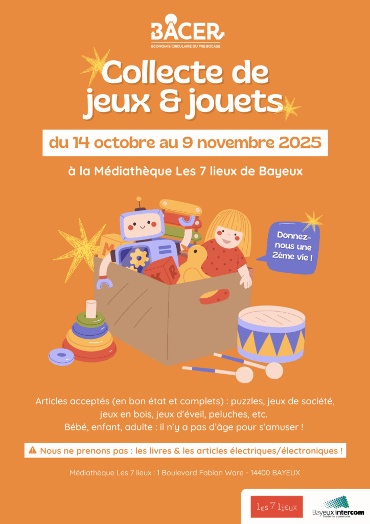Du 14 octobre au 9 novembre 2025, la Médiathèque Les 7 lieux à Bayeux accueillera une collecte de jeux et jouets, organisée par la BACER du Pré-Bocage, avec le soutien de Bayeux Intercom (Ville de Bayeux).